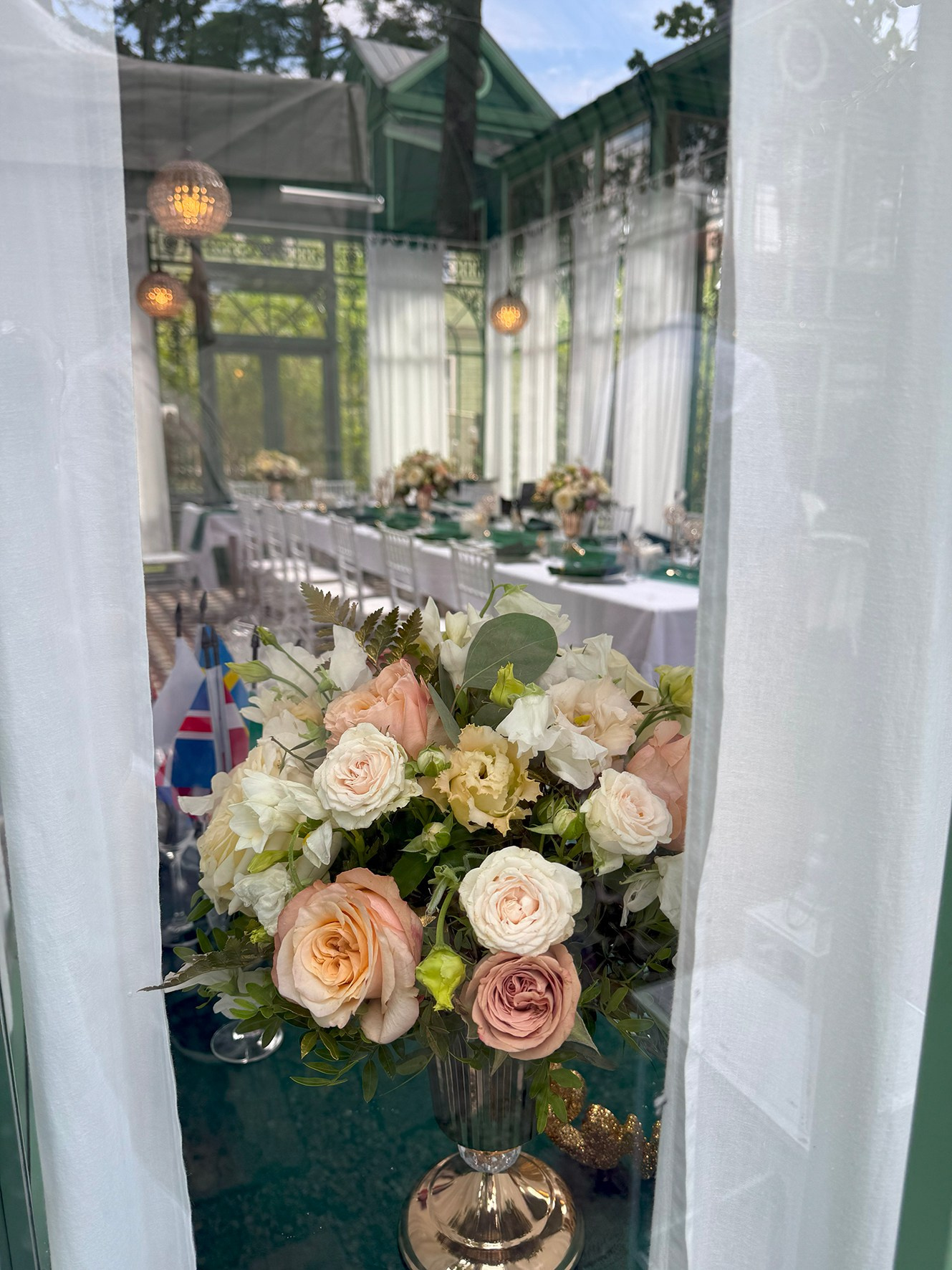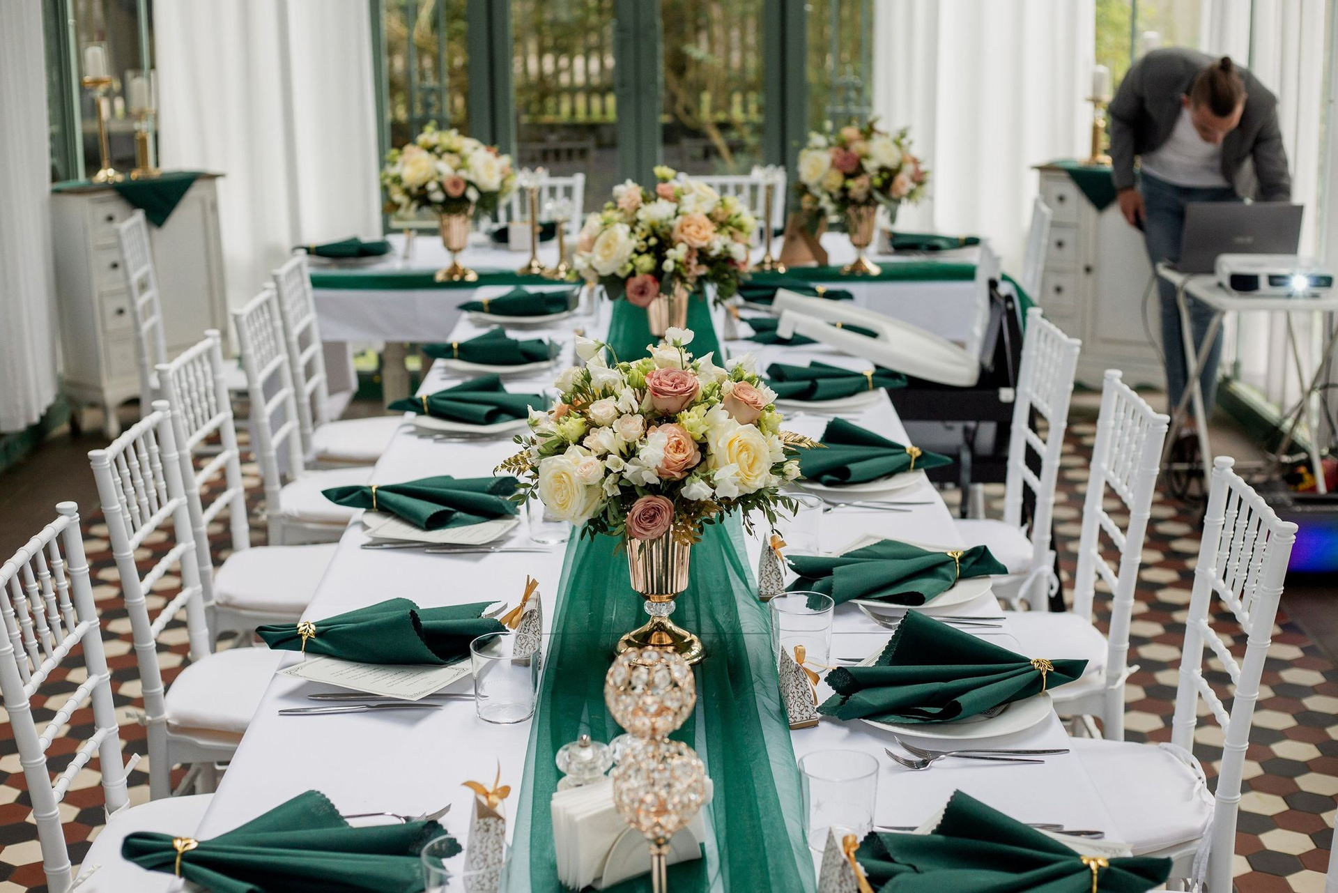 Декор стола молодоженов, свечи, подсвечники, живые цветы в бело-зеленной гамме